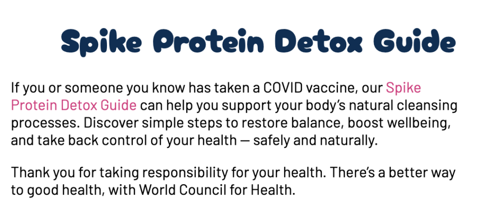 World Council for Health comprises scientists and doctors who are free from conflicts of interest. Together we are helping people around the world detox from the foreign spike proteins produced by these genetic vaccines in the hope that it will reduce their risk of getting ill.